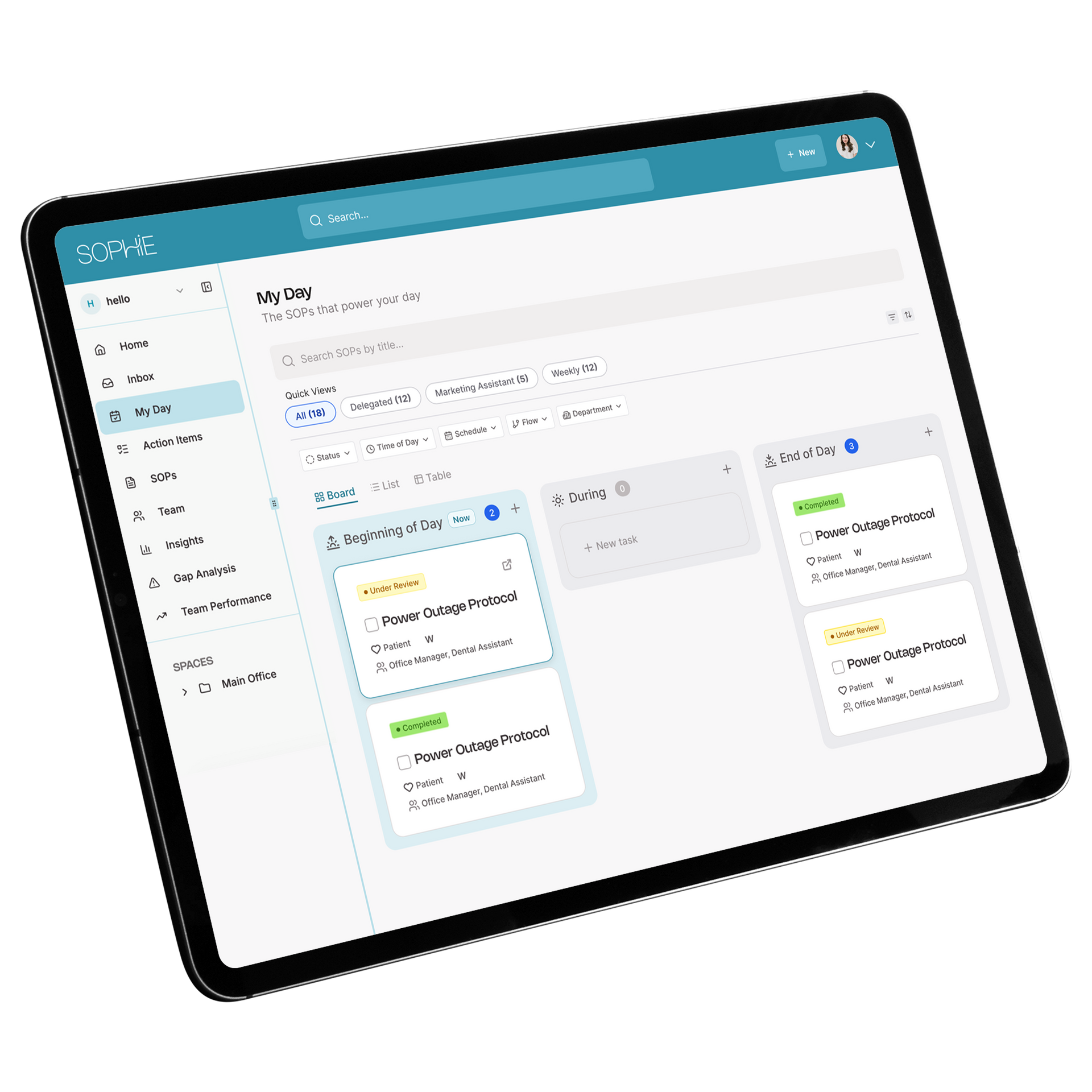 Operational stability emerges when expectations remain visible and execution standards hold across the practice. SOPHIE reinforces those standards across the systems that drive daily performance.